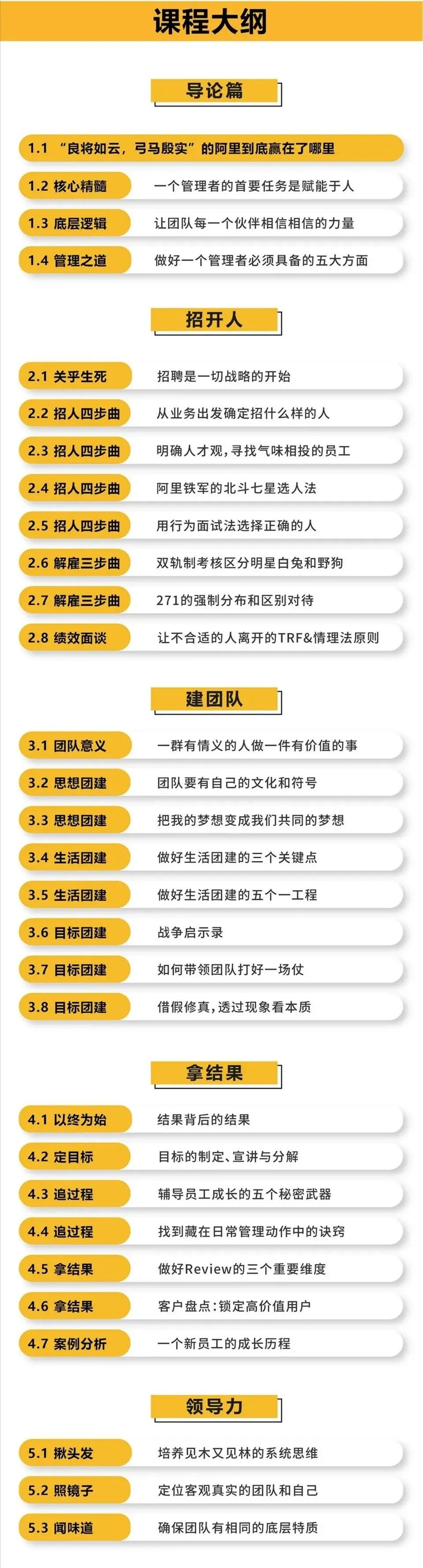 课程以“招开人、建团队、拿结果”为核心要点展开,并辅以案例,围绕创业公司常见的管理问题,以阿里先进的管理经验分析解读。