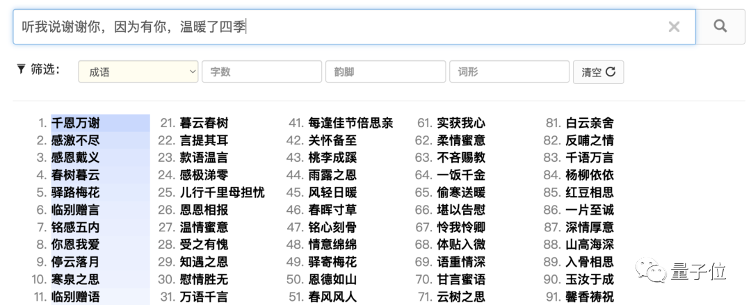比如还是这句“听我说谢谢你,因为有你,温暖了四季”,用成语应该怎么说?