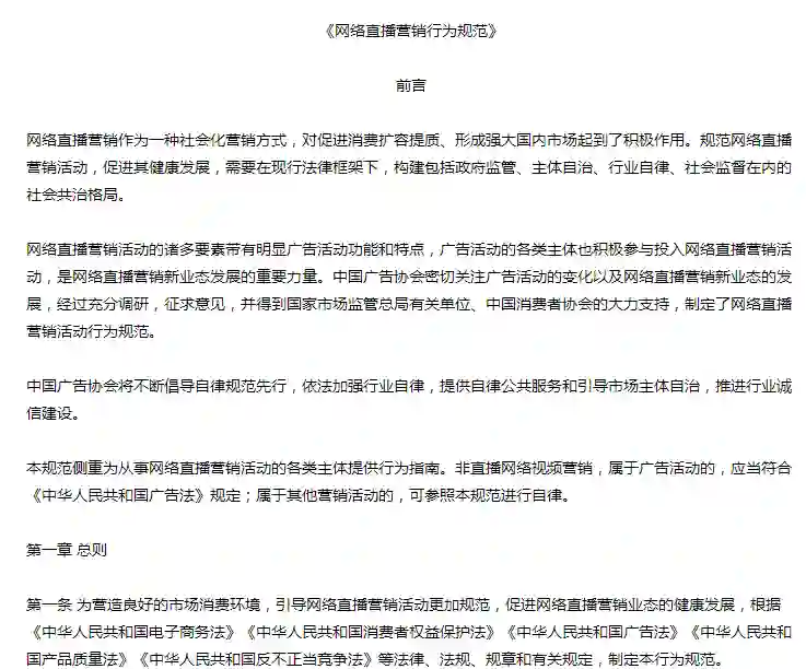 2020年6月,中国广告协会发布国内首份《网络直播营销行为规范》,对直播电商中的各类角色、行为都作了全面的定义和规范,并针对当下直播电商存在的问题点进行了详细的管理说明。