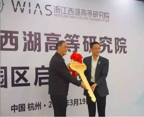 杭州市市委常委、组织部部长张仲灿向浙江西湖高等研究院院长施一公交接园区钥匙