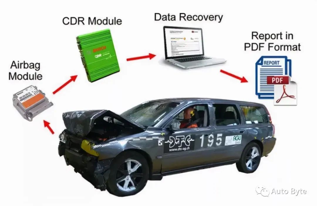 在汽车上,EDR被要求记录车辆碰撞期间的速度、ABS状态、方向盘的转向角度、气囊状态、制动状态等数据关键数据