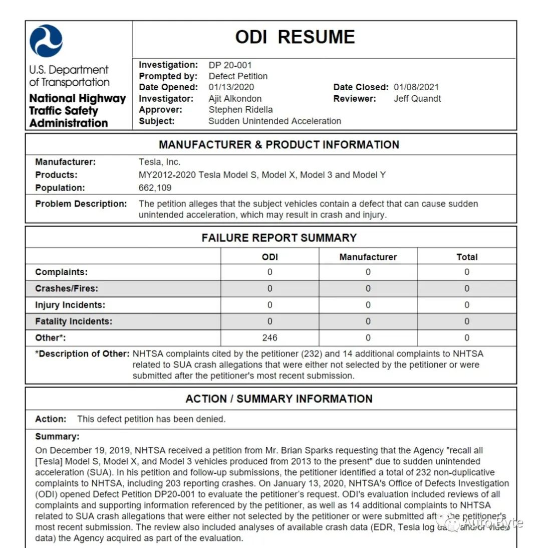 然而,NHTSA在2021年1月8日公布的246起事故的调查结果,却与很多人预留的不同,报告显示:凡有数据的事故都有证据表明,意外加速是由于误踩加速踏板引起的;没有证据表明,特斯拉的加速踏板、电机控制系统或制动系统存在任何导致事故发生的故障;没有证据表明,特斯拉存在容易诱发误踩加速踏板的设计缺陷。