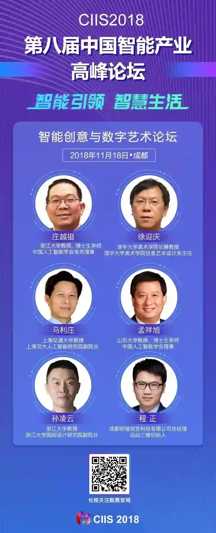 2018年11月17日~18日,CIIS2018(第八届中国智能产业高峰论坛)将在成都召开,届时在大会分论坛——“智能创意与数字艺术专题论坛”上将特邀6位业界专家出席,浙江大学教授、博士生导师,中国人工智能学会常务理事庄越挺教授做分论坛主席。