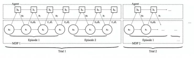 这就是 RL²(通过慢速增强学习进行快速增强学习)所采用的方法。这个模型的基础结构是循环神经网络(具体来说,是一个 LTSM 网络)。因为 RNN 有储存状态信息的能力,并且给出不同输出,这些输是该状态的函数,所以理论上它们可以学到任意可计算的算法:换而言之,它们都具有图灵完备的潜力。以此为基础,RL² 的作者设计了一个 RNN,每一个用于训练 RNN 的「序列」事实上都是一组具有特定 MDP(MDP = Markov Decision Process,马尔科夫决策过程。基于这个解释,你只需将每次 MDP 看作定义一系列可能动作并且在环境中对这些动作产生奖励)的经验片段。接着,会在许多序列上训练这个 RNN,像一般的 RNN 一样,这样就会对应多个不同的 MDP,并且 RNN 的参数会被优化,使得找所有序列或试验集合中产生的负反馈(regret)较低。负反馈(regret)是一个可以捕获你一组事件中所有奖励的度量,所以除了激励网络在试验结束时得到更好的策略之外,它还可以激励网络更快地进行学习,以致于网络会在低回报的策略中更少地使用探索性动作。