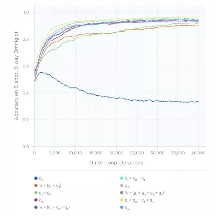 2018 年初,OpenAI 又发表了一篇名为 Reptile 的论文(https://arxiv.org/abs/1803.02999,AI 科技评论往期文章点这里)。正如你可能从它的名字中猜到的那样——使用了早先的 MAML 的方法起名。Reptile 以 MAML 为前提,但是找到了一种更高效的循环计算更新初始参数的方法。MAML 需要显式地计算在初始化参数 theta 下运行的测试集损失的梯度,Reptile 则仅在每项任务中执行了几步 SGD 更新,然后用更新结束时的权重和初始权重的差异,作为用于更新初始权重的「梯度」。