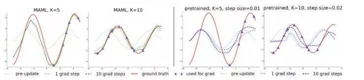 为了进一步明确这一点,请看上图。上图对 MAML 和一个预训练网络进行了比较,这两个网络都用一组由不同相位与振幅组成的正弦曲线组成的回归任务进行训练。这之后,两个网络都针对新的具体任务进行了精细调节(fine-tune):如红色曲线所示。紫色三角的代表寥寥几步梯度步中使用的数据点。与预训练网络相比,MAML 学到了例如——正弦曲线具有周期性结构:在 K=5 时,它可以在没有真正从空间的这一区域观察到数据的情况下快得多地将左边的峰值移到正确的地方。虽然说很难判断我们的解释是不是与底层发生的情况完美地相匹配,但我们不妨推测: MAML 在算出两个相关正弦曲线不同之处——相位和振幅——方面做得更好,同时也能更好地从给定的数据中学到它们的数据表示。