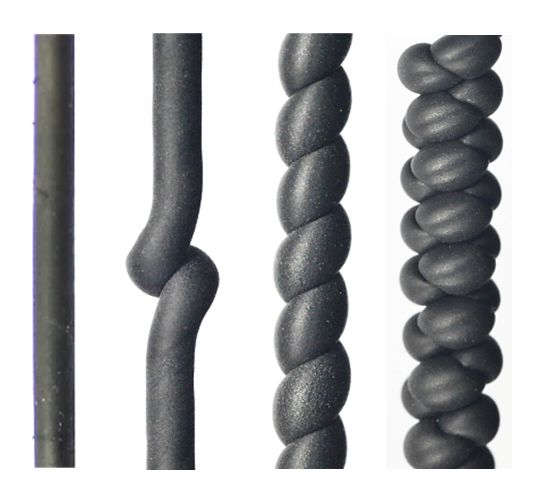 图1“扭热制冷”中,对橡胶纤维加捻会生成不同的结构:加捻、部分螺旋、全部螺旋、和超螺旋,橡胶直径:2.5 mm,预拉伸应变:200%。
