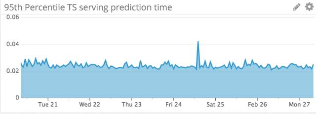 我们在产品中已经使用TensorFlow Serving大概半年的时间,我们的使用体验是相当平稳。它具有良好的预测时间延迟。以下是我们的TensorFlow Serving实例一周内的预测时间(以秒为单位)的第95百分位数的图(约20毫秒):
