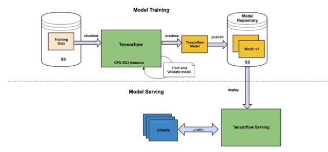 然后使用AWS中的GPU实例和S3中的批量训练样本训练TensorFlow模型。