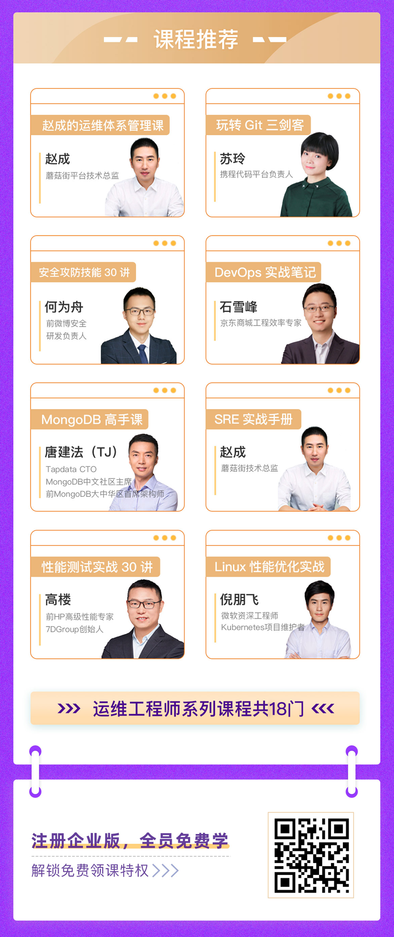 除上述运维系列课程外,企业(研发团队)开通极客时间企业版账号,全员可免费学前端、后端、架构、测试、大数据、云、分布式等各领域课程。👇