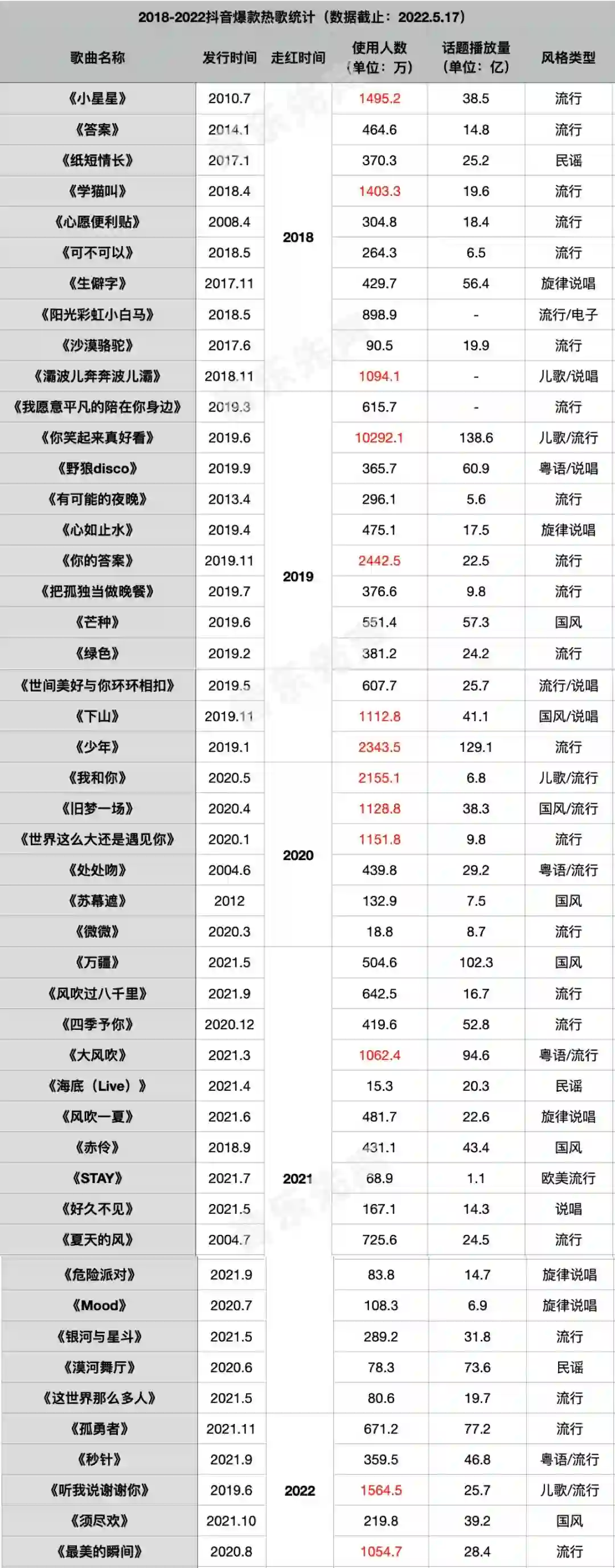 为了探究这个问题,我们参考抖音近5年的年度报告、年度歌曲和平台数据,收录了48首热歌,并从使用量、播放量、风格等维度进行分析。