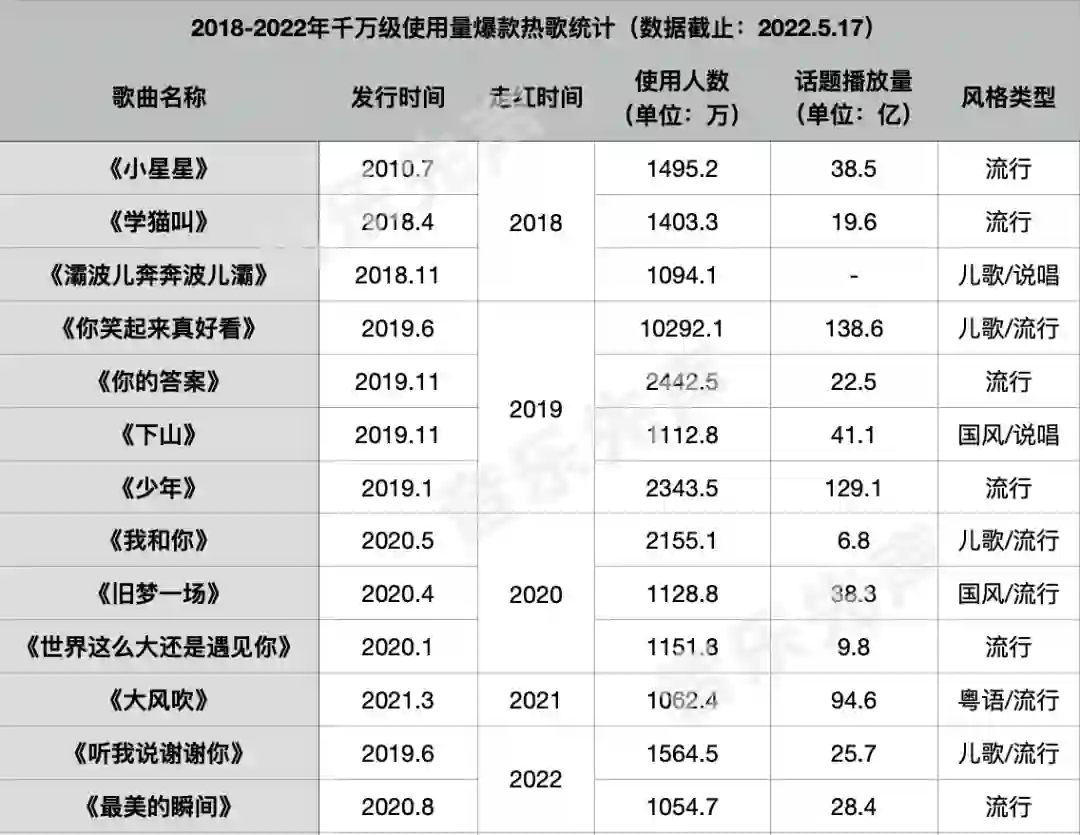 这48首热歌里,达到千万使用量标准的数量共计13首,具体到各个年份分别为3首(《小星星》《学猫叫》《灞波儿奔奔波儿灞》)、4首(《你笑起来真好看》《你的答案》《下山》《少年》)、3首(《我和你》《旧梦一场》《世界那么大还是遇见你》)、1首(《大风吹》)、1首(《听我说谢谢你》《最美的瞬间》),其中2019年的《你笑起来真好看》的使用人数更是突破了1亿。