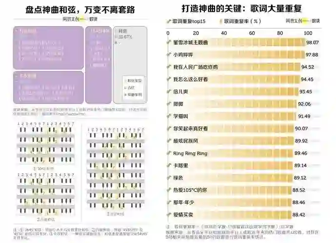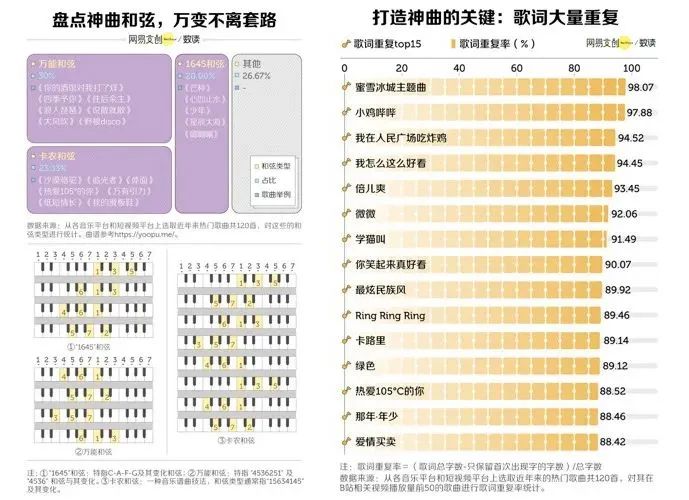 一首歌火了,会出现一大批相似风格、主题甚至旋律的歌,迅速消耗掉大众的兴趣。相关统计显示,最受神曲追捧的和声进行无非三种:1645和弦、万能和弦和卡农和弦。