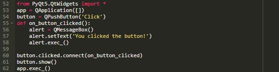 Qt使用一种称为信号的机制,让你对诸如用户单击按钮之类的事件作出反应。下面的例子说明了这一点。它包含一个按钮,被点击时,它会显示一个消息框: