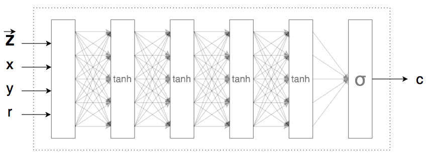与CPPN-NEAT不同,我们要在这个实现中使用的神经网络将仅仅是一个由用户定义的多层前馈网络。例如,用户可以修改TensorFlow代码,使f(w, x, y, r)成为由双曲线正切、relu、softplus、正弦曲线等定义的前馈神经网络。每一层还将有一个额外的偏置输入,出于简明的考虑,图中省略了这个偏置输入。