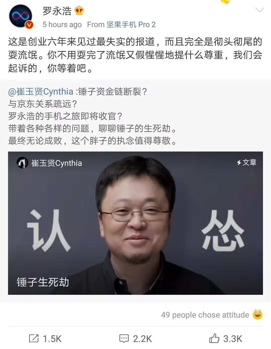 对此,罗永浩发布微博称:“这是创业六年来见过最失实的报道”,并表示“会起诉的”。