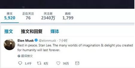 马斯克发推文缅怀,他表示,斯坦·李为人类所创作的想象和快乐的世界将永远存在。