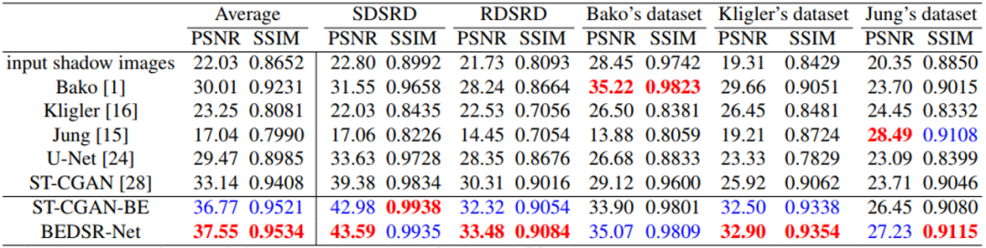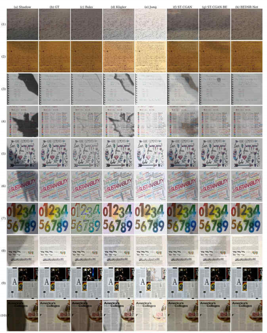作者主要对比了文档图像去阴影的几个传统方法(Bako[1], Kligler[3],Jung[4]),以及一篇自然场景图像去阴影的深度学习方法ST-CGAN[5]。作者还将BE-net模块集成到ST-CGAN中,以此来证明其有效性,表示为ST-CGAN-BE,网络结构如图7所示。此外,U-net也作为Baseline加入了对比。定量指标的比较如表1所示,从表中ST-CGAN[5]和ST-CGAN-BE的比较可以看出BE-net模块的有效性,在增加了BE-net模块之后指标有了很大的提升。在大多数数据集上本文方法都取得了相比传统方法更好的结果。