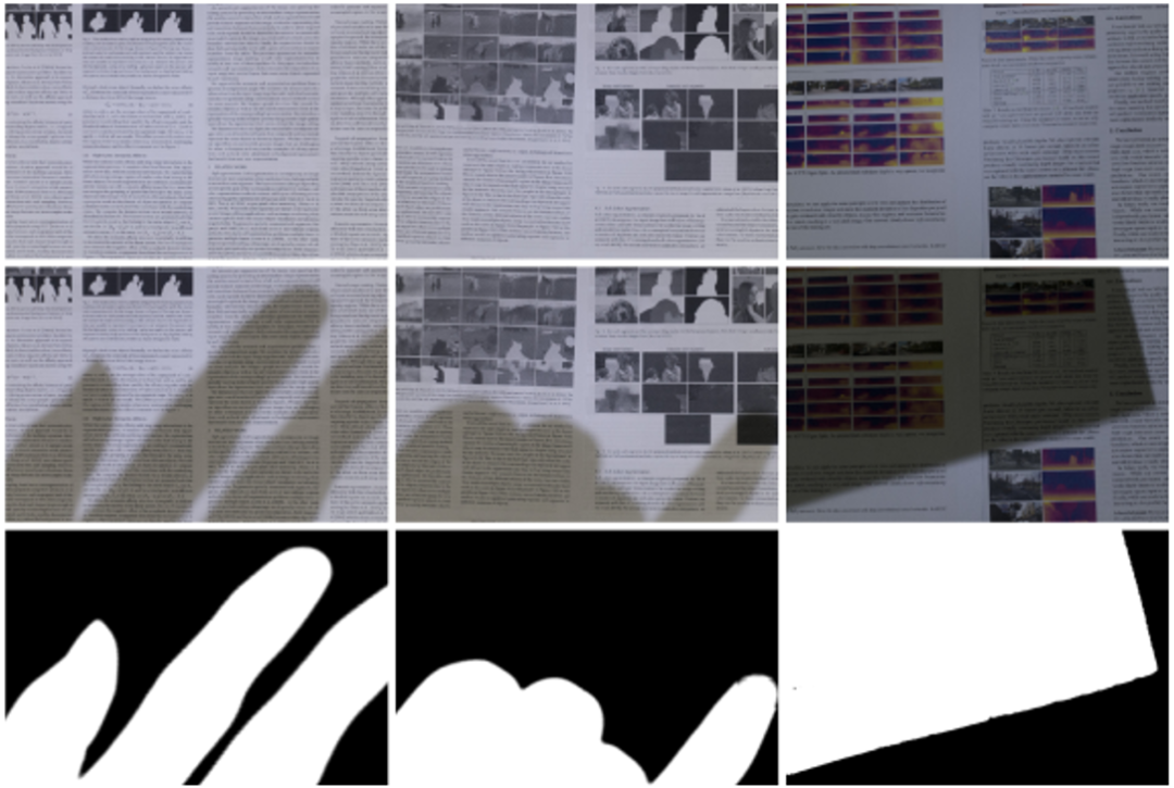 训练用合成数据:作者采集了970 张干净的文档图像(多数是直接从已有的公开数据集中采集的),然后通过Blender和Python脚本,在采集到的文档图像基础上添加阴影,并在此基础上得到Shadow Mask(本文方法不需要用到,主要用于对比其他方法)一共合成了8,309个训练样例。