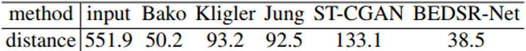 定量和定性比较都证明了本文方法的有效性以及优越性,超过了目前SOTA的方法,通过将BE-net整合到ST-CGAN上也很好的证明BE-net的有效性。