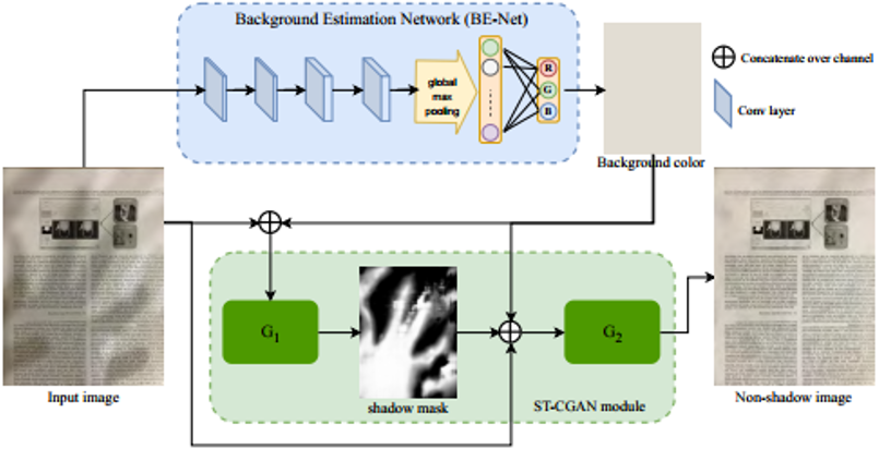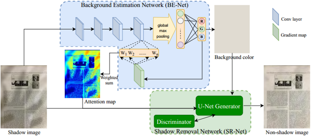 本文针对拍摄文档图像去阴影问题提出了BEDSR-Net网络,该网络由背景估计网络(Background Estimation Network, BE-net)以及阴影去除网络(Shadow Removal Network, SR-net)这两个子网络构成,BE-net以阴影文档图作为输入,预测输出该文档图的纸张颜色(R,G,B)三个值,以及反映阴影分布情况的注意力热图(Attention Map)。将这两个输出与原始的阴影文档图一起输入给SR-net(包含判别器,引用了GAN Loss),最终输出得到阴影去除后的文档图像。