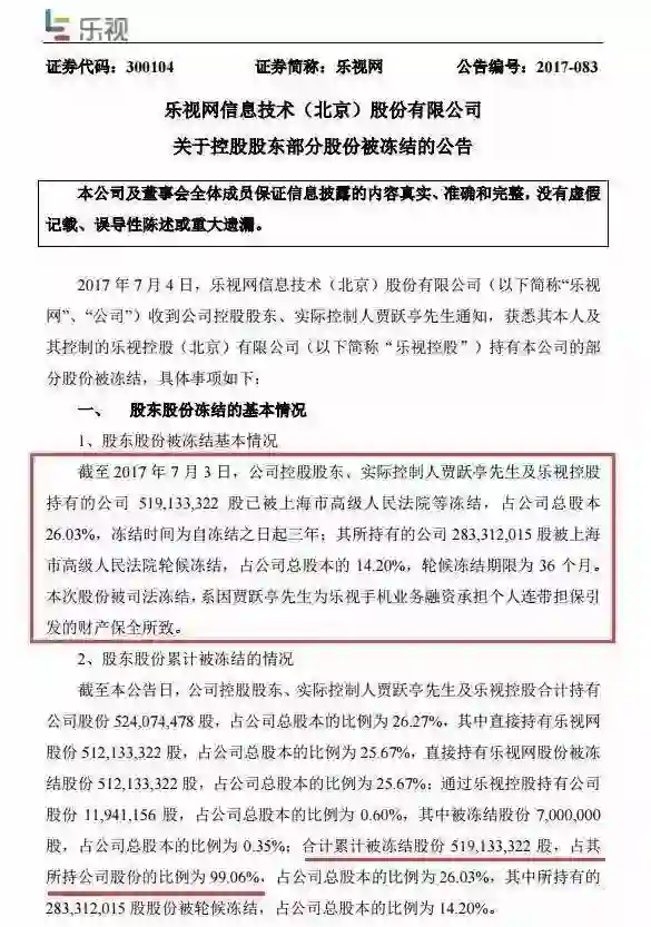 7月4日,乐视网发布公告称,公司控股股东、实际控制人贾跃亭及乐视控股持有的公司5.19亿股已被上海市高级人民法院等冻结,占公司总股本26.03%,但占贾跃亭所持乐视网股份的比例为99.06%。以乐视网最新价格30.68元计算,贾跃亭及乐视控股被冻结的这批股份价值159.27亿元。