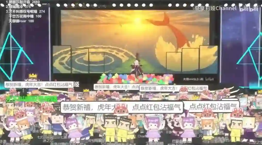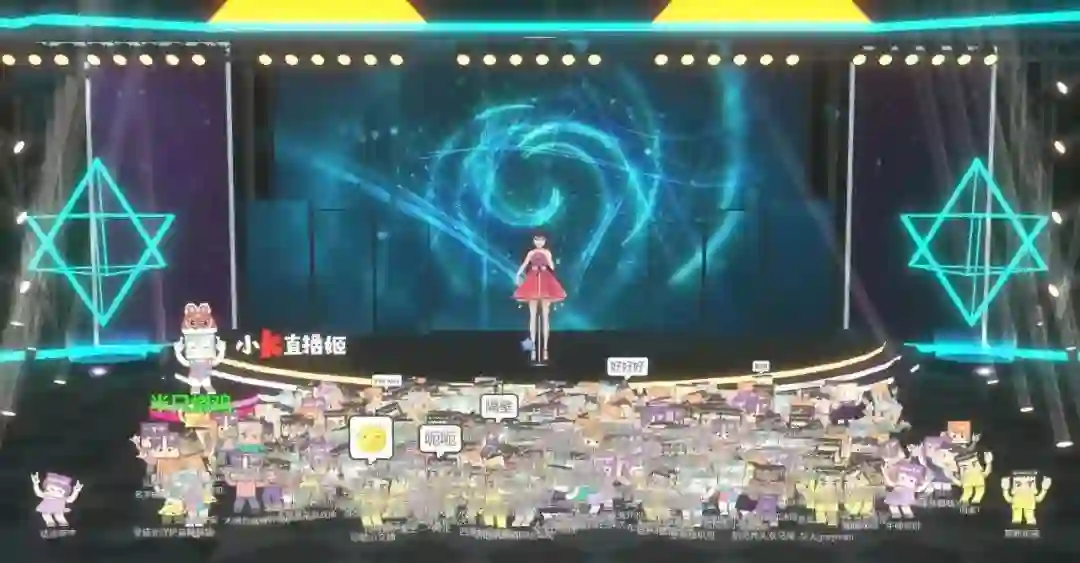 ,虚拟主播以演唱者和舞台DJ的身份出现在虚拟演唱会和轰趴馆的场景中,粉丝通过发送弹幕即可生成和操控自己的虚拟形象,和虚拟主播进行互动应援。