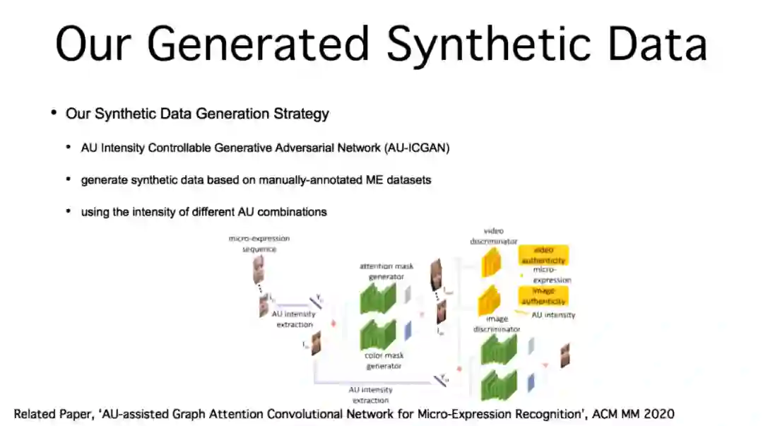 谢洪霞首先回顾了由中国科学院心理研究所王甦菁博士参与组织的三届微表情挑战赛(MEGC2018, 2019, 2020)和目前发展自动化微表情识别面临的局限,即标注的样本量少的问题。她接着介绍了通过可控人脸动作单元(Action unit, AU)强度的对抗生成网络(AU-ICGAN)生成微表情样本的方法,该方法为微表情识别挑战赛提供大量的训练样本。下图分别为AU-ICGAN和生成样本示例。