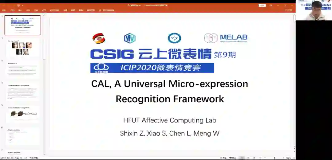 此次讲座主要分为三个部分,首先谢洪霞博士研究生对ICIP2020微表情大赛进行了简要介绍,然后由大赛第一名(郑仕鑫)和第五名(张皓云)团队分别对其微表情识别方法进行了介绍。