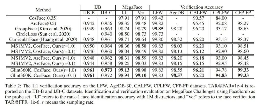 我们在内部的业务和FRVT竞赛上都验证了这个方法,再学术界的测试集IJBC和Megaface上,使用Glint360K的Full softmax和10%采样会有着相当的结果。