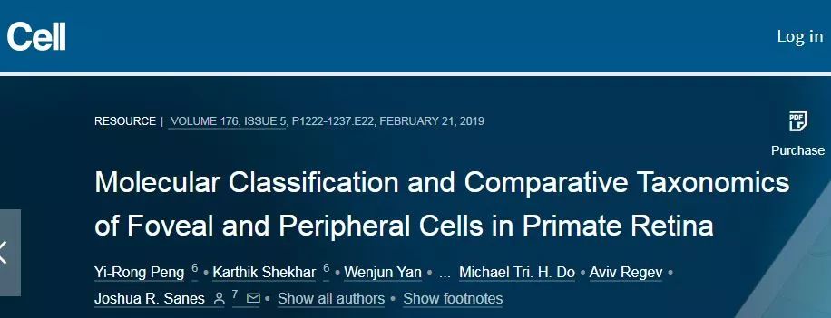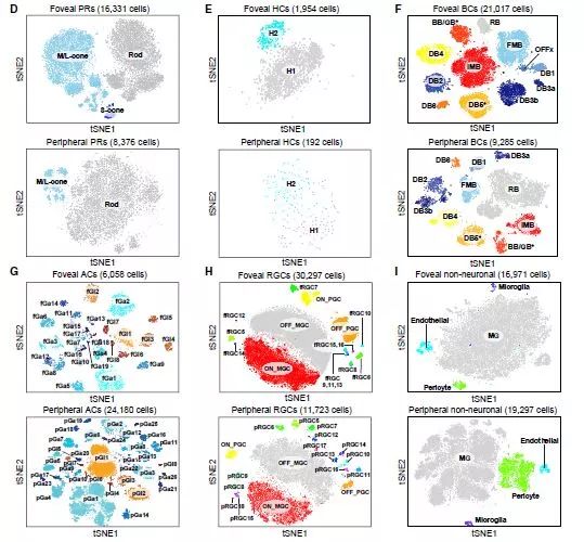 最终,他们在中央凹和外周视网膜中均鉴定出了近70种不同类型的细胞,并且还知道了每一个类型的细胞表达哪些基因。