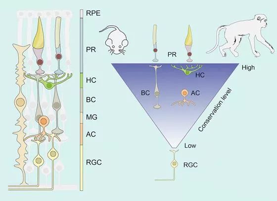 ▲在小鼠和食蟹猴之间,视网膜中相比其他类型的细胞,负责向大脑传递信号的神经细胞差别尤其大(图片来源:参考资料[1])