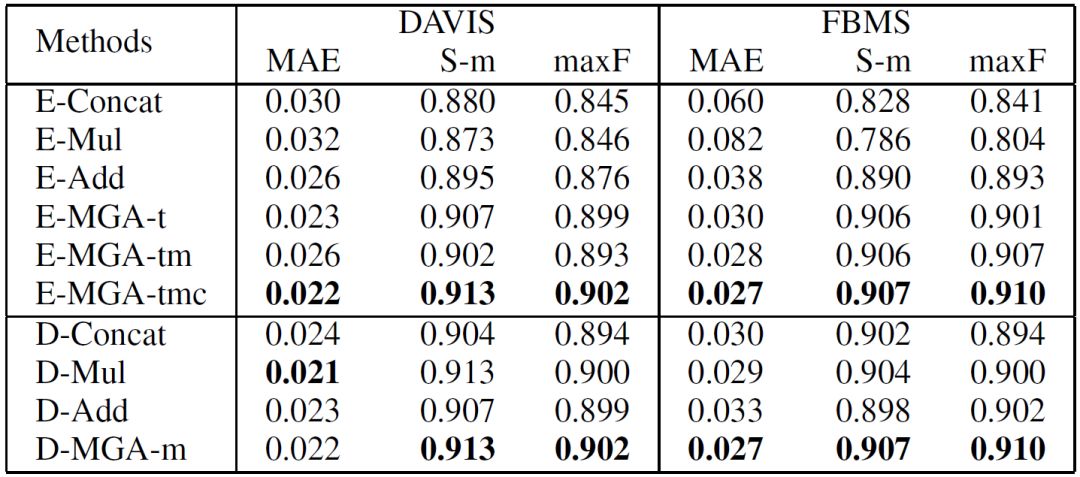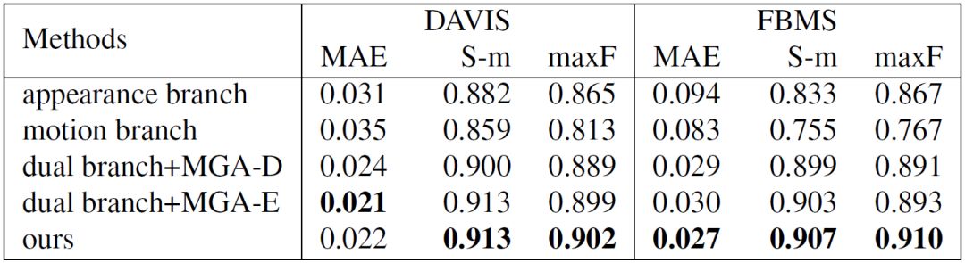 作者还尝试仅保留编码器部分(MGA-E)或者解码器部分(MGA-D)的注意力模块。实验结果显示,双分支结构有效利用了运动信息,优于任一单分支网络。