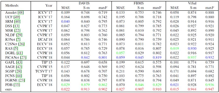 下文报告几个主要的实验。第一个实验将MGA与现有的视频及图片的显著物体检测方法在三个数据集DAVIS、FBMS和ViSal上比较。