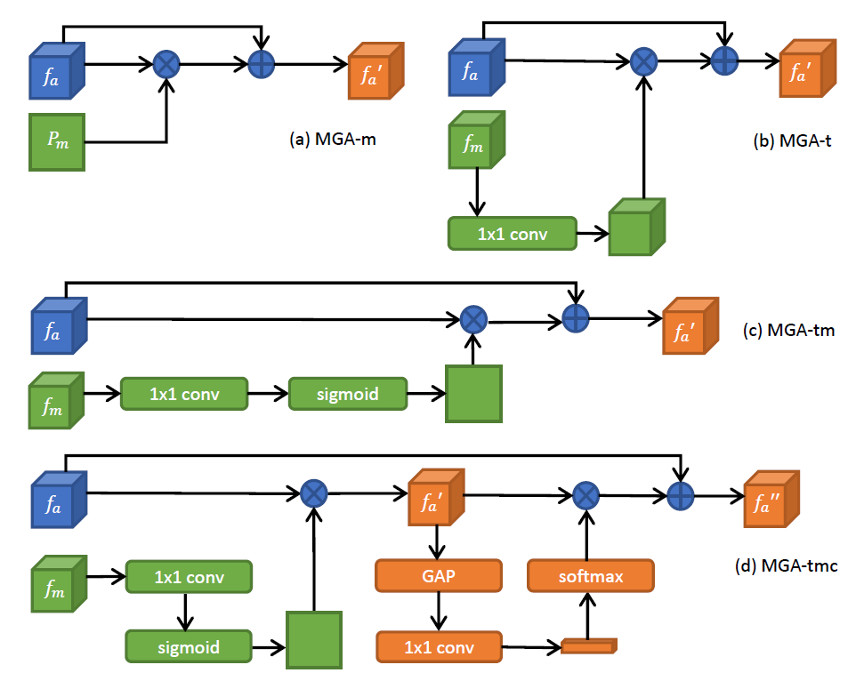 MGA-{0-5}可看作部署注意力模块的“槽”,其中MGA-5仅可采用模型一(运动信息是二维显著图),MGA-0至MGA-4可采取模型二三四中的某一种,一般采用同一种。