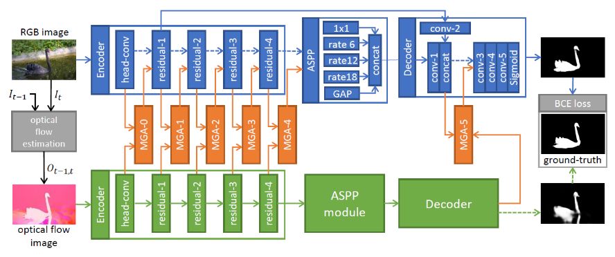 MGAnet包含一个以RGB图像为输入的外观分支,一个以光流可视化图片为输入的运动分支,以及连接两分支的6个注意力模块MGA-{0-5}。外观分支的编码器可为ResNet-101或ResNet-50,运动分支的编码器可为ResNet-34或ResNet-18,不同组合均可达到SOTA的性能。