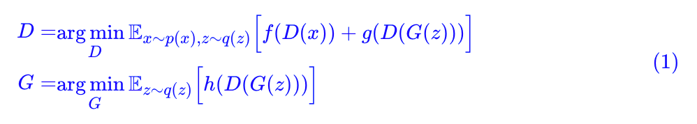 自然就是生成器和判别器了,f, g, h 则是一些确定的函数,不同的 GAN 对应着不同的 f, h, g。