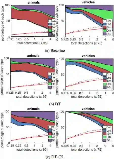 为验证本文方法的有效性,作者采用论文 [5] 提供的方法对检测效果进行分析,分析结果如图 4 所示。从图中可以看出基于 DT 变换的微调模型能够很好的提高物体检测的性能,相对于 DT 来说,基于 DT+PL 的微调策略能够进一步地提高检测的性能,尤其是在容易将物体误分成不相似类别物体的分类任务上(Sim 将物体识别成与该物体类似但不相同的类别,Oth 将物体识别成其他不相似的类别)。这也进一步说明了为何图像级标注可以提高物体检测的性能。