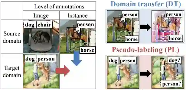 为解决这一问题,本文提出了基于域适应的弱监督学习策略,其可以描述为:(1)选取一个带有实例级标注的源域数据;(2)仅有图像级标注的目标域数据;(3)目标域数据的类别是源域数据类别的全集或子集。