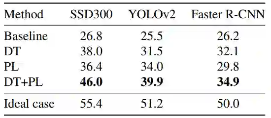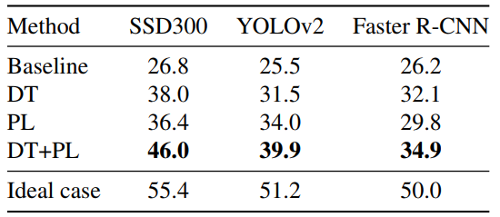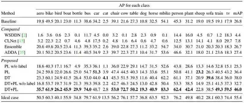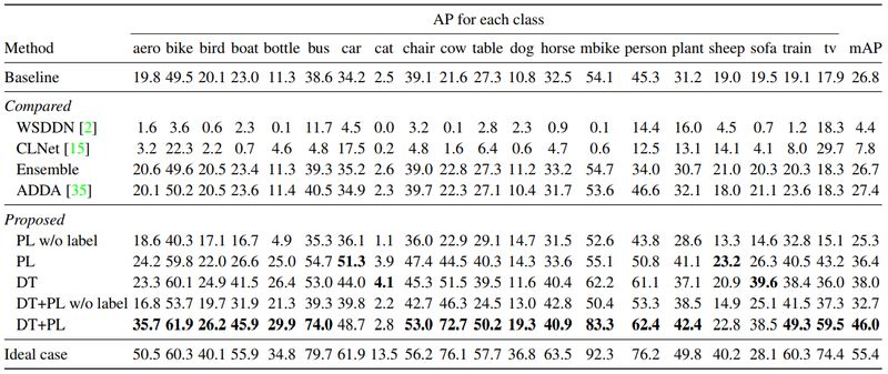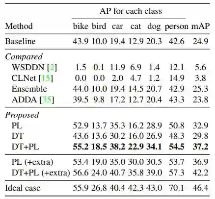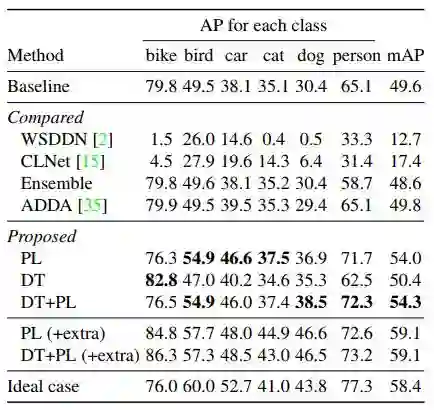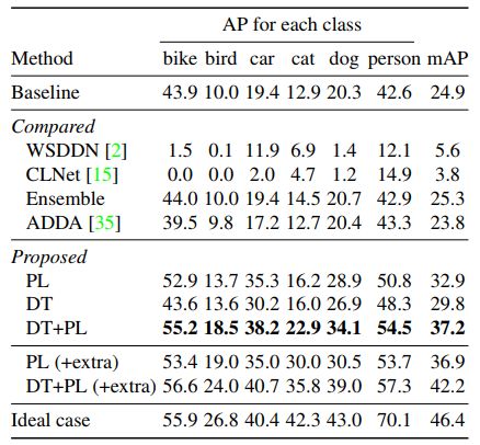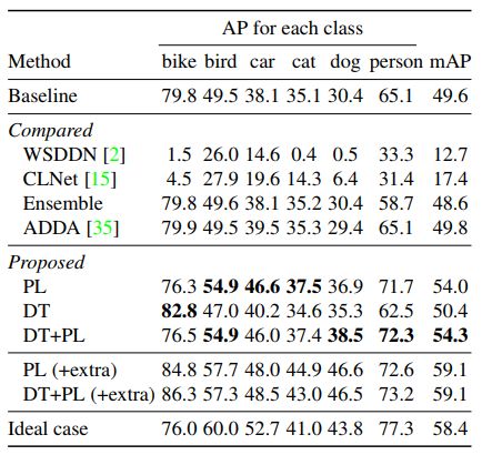 为证明方法的有效性,作者分别利用 PL、DT、DT+PL 的微调方法进行了实验,在 Clipart1k 数据集上的实验结果如表2所示。其中,基线(Baseline)是利用 SSD300 直接在目标域图像上进行实验的结果,而理想情况(Ideal case)是利用带实例级标注的目标域数据对模型进行微调的结果。此外,作者还利用基于弱监督检测的方法 ContextLocNet [2]、WSDDN [3] 及无监督域适应的方法 ADDA [4] 来做对比实验。