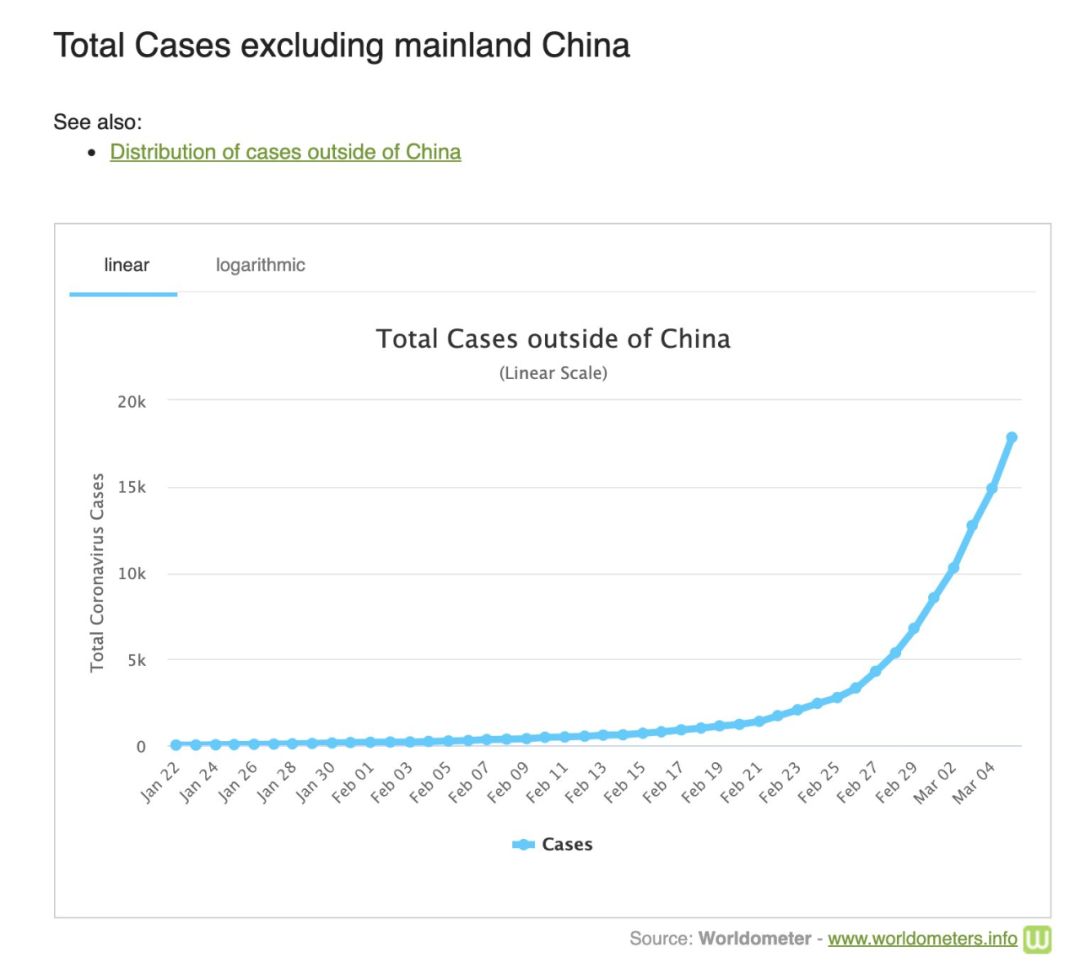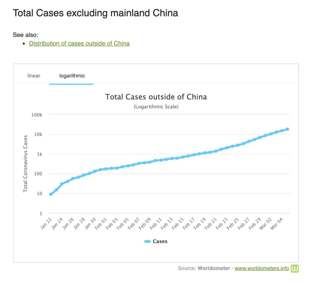 中国大陆以外的 COVID-19 病例数增长和指数函数如此接近,几乎呈现出完美的指数增长形态。