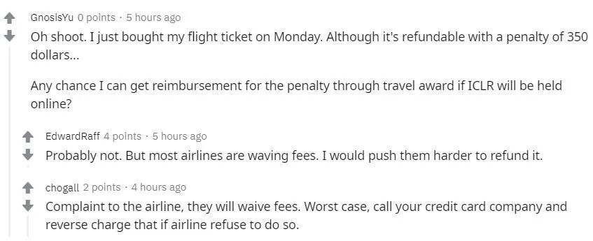 距离原定的开幕日期只有不到两个月时间,很多人已经订好了往返亚的斯亚贝巴的机票,ICLR 2020 即将改为线上的消息一出,立即引发了人们的迅速关注。国际航班的机票可不会像春节期间国内的一样无条件全额退款: