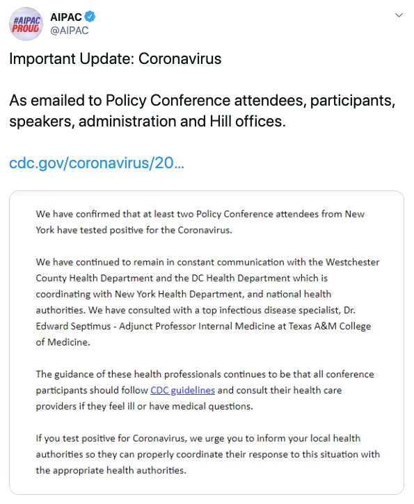 这周三,所有参加了美国以色列公共事务委员会大会的成员都收到了一份通知,有两位来自纽约的参会者与新冠肺炎确诊病例有过接触。