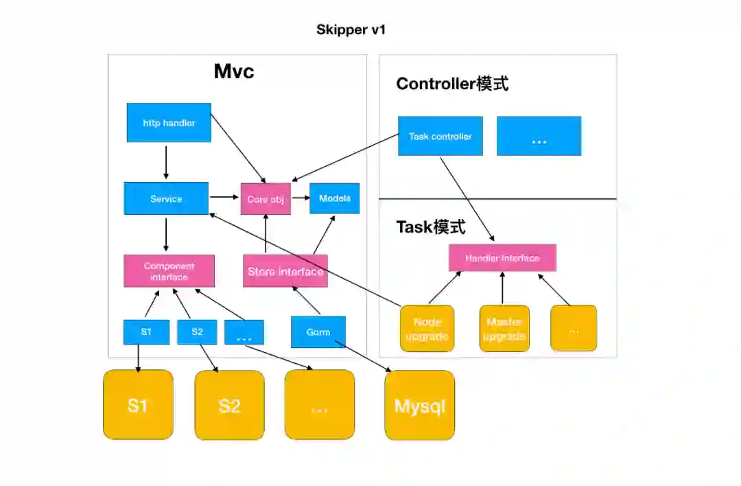 基于 Dashboard 存在的问题,我们设计了 Skipper 项目架构的 v1 版本,这个版本依然使用 MVC 分层,但是针对 Dashboard 的问题,重点关注了外部依赖接口化、DB 依赖接口化、充血模型、Task 异步流程、模块划分等。Dashboard 到 Skipper v1 的架构变动如下图。