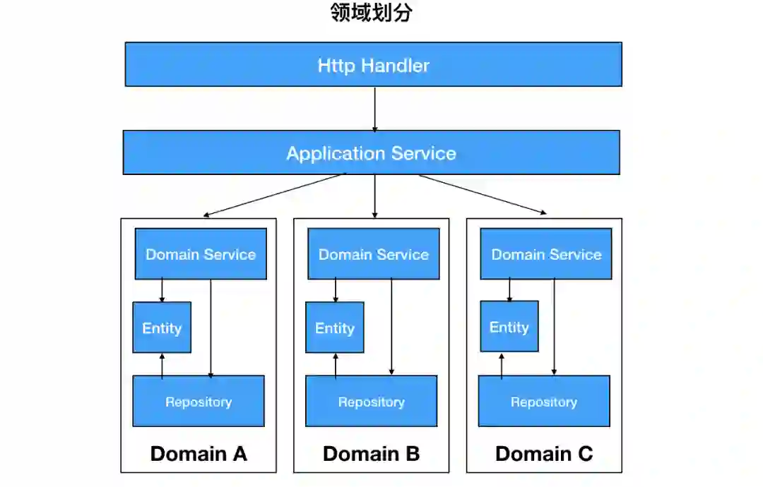 领域驱动开发中,每个领域称为 Domain,每个 Domain 有自己的领域实体,并且是充血模型,每个领域的存储也是内聚在领域之中,综合以上,水平分层应当如下。