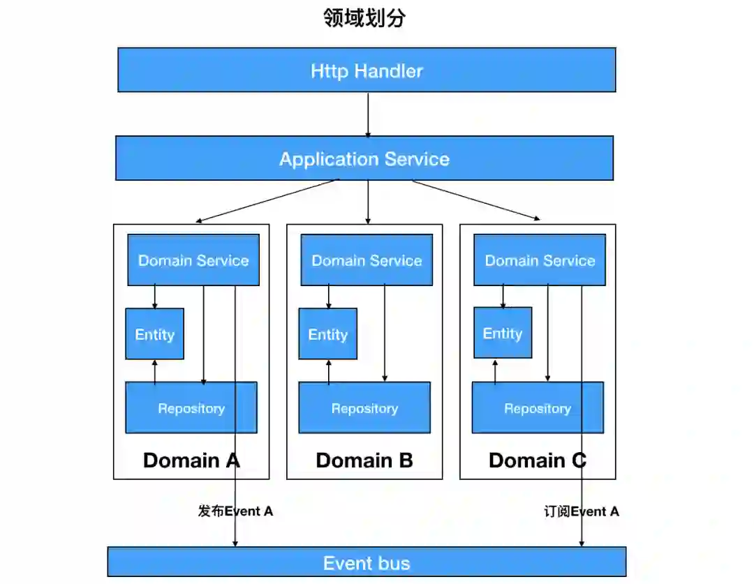 我们再根据各个业务模块的依赖关系紧密程度进行重组,形成领域,每个领域只处理自己领域的业务,每个领域对外暴露一套 Service 接口用于描述该领域对外暴露的能力,领域可以利用 Event Bus 对外发布事件,用于通知外部领域内正在发生的事;