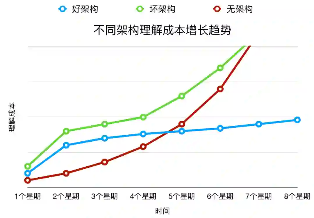 也就是说,架构良好的项目随着业务复杂度增加,项目理解成本增长也是缓慢的。架构不合理的项目随着业务复杂度的增加,整体理解成本可能是指数增长的。