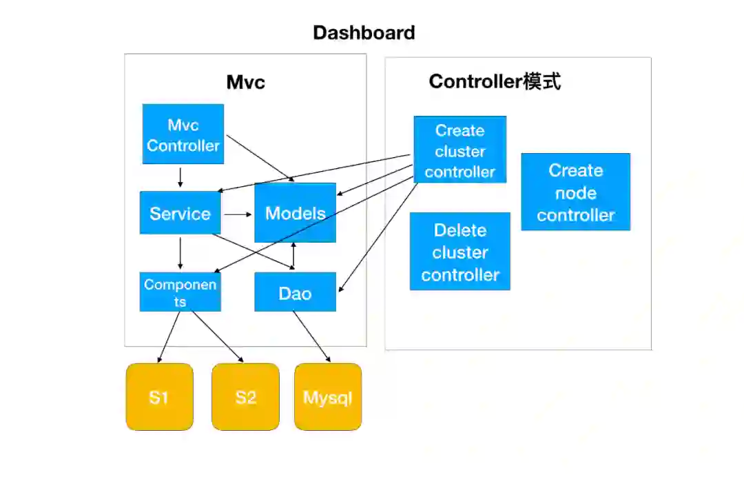 Dashboard 整体采用 MVC 架构 + Controller 模式,这里的 Controller 模式是指通过不断重试,最终将目标对象设置到某种目标状态的模式,比如通过不断重试,将创建中的集群的各部分属性或者依赖的资源,设置到正常集群的状态。Dashboard 的核心模块如图。