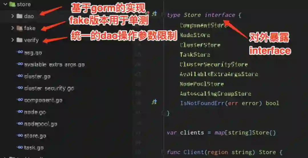 由于使用了充血模型,存储层只有最基本的 CRUD,我们很方便得加入了 store interface 来解耦系统和具体存储,store 层还提供基于 gorm 的具体实现,以及 fake 版本的实现用于单元测试。