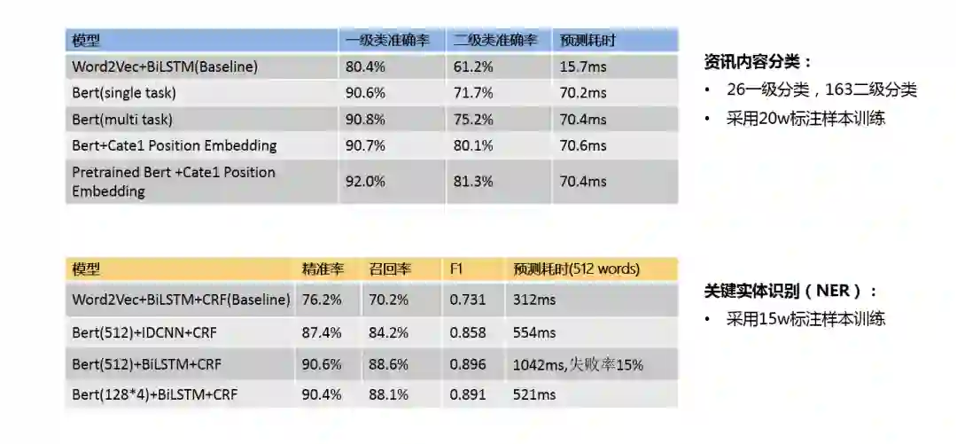从上面的表格中可以看到,整个迭代优化过程,我们最早Baseline采用了word2vec+BiLSTM方式,一级类预测准确率为80.4%,二级类准确率在61.2%,预测耗时是15.7ms。